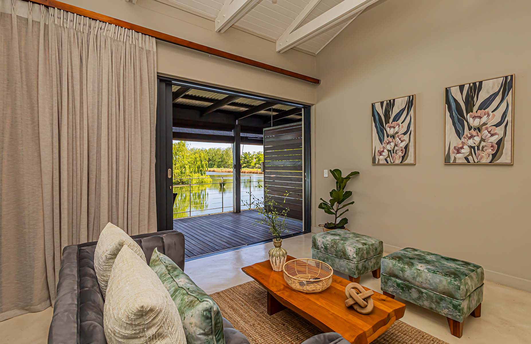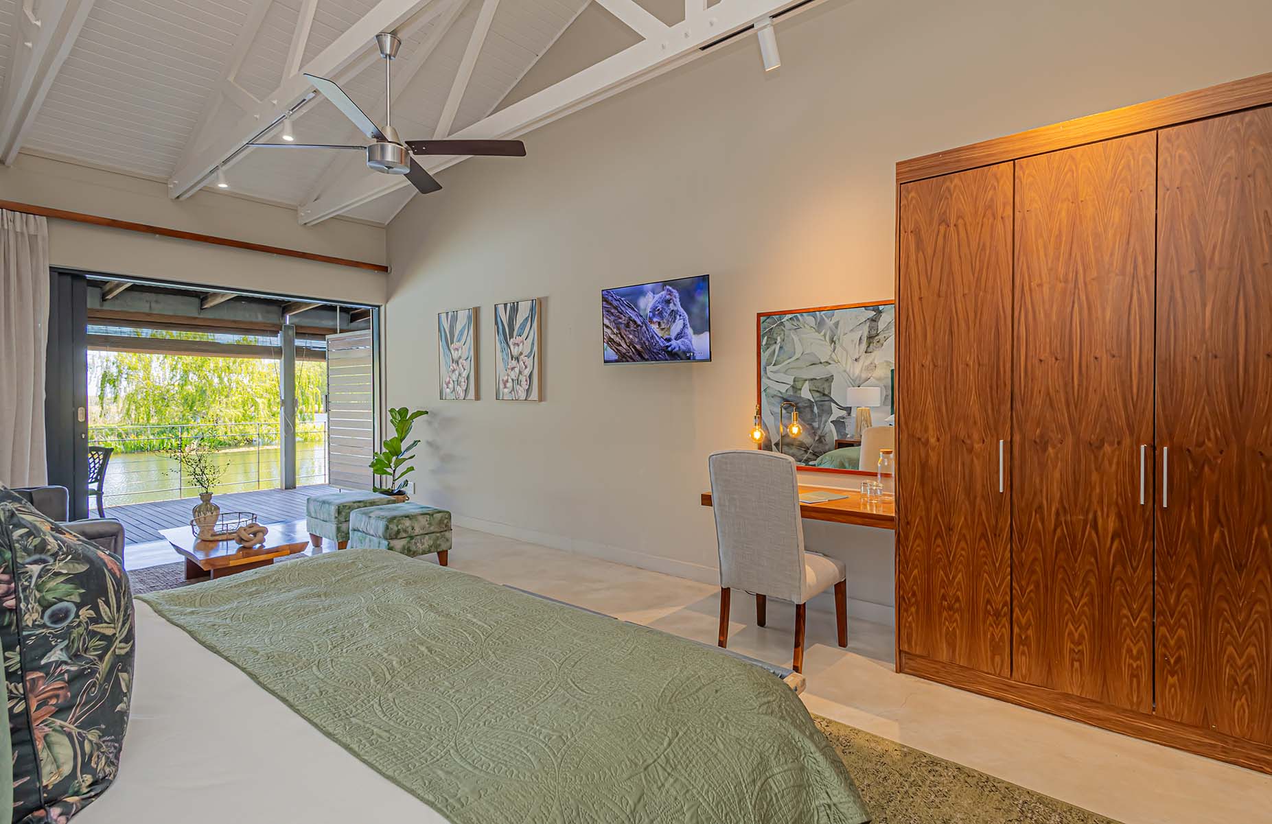 This suite provides a perfect combination of comfort and beauty, with a view of a peaceful lake and the picturesque scenery of Stellenbosch. All rooms have sliding doors that open onto a veranda with an amazing view of Table Mountain. Step out onto the balcony to enjoy the breath-taking vista, whether you’re admiring the lake from the double bed, relaxing in the sitting area.
